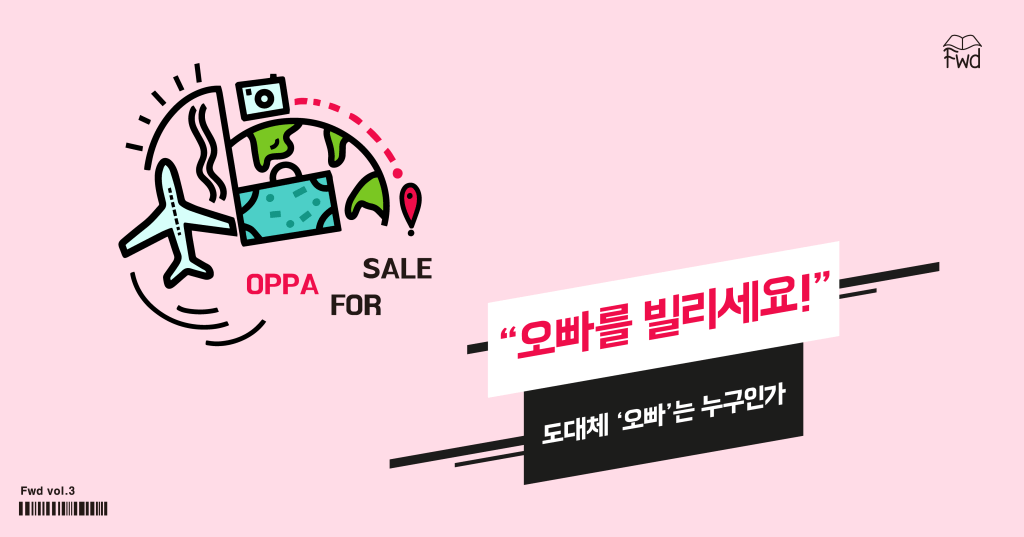 ‘오빠’가 그 자체만으로 상품이 될 수 있다니. 도대체 ‘오빠’가 뭐길래. ‘오빠 투어’의 존재를 처음 접했을 때 들었던 생각이다. 지금 이 글을 읽고 있는 독자들도 비슷한 생각을 하고 있으리라. 사실 ‘오빠’라는 말은 한국어 사용자라는 작은 언중을 넘어 국제적인 공용어가 된 지 오래다. 영어 신조어나 유행어, 슬랭의 의미를 정리해 놓은 크라우드 소스 인터넷 사전 <Urban Dictionary>에는 ‘Oppa’ 항목이 버젓이 존재하며(페이지 보기), 중국어 문화권에서는 ‘오빠’가 손위 남자 형제를 가리키는 단어 ‘哥哥(gege)’로 번역되지 않고 ‘오빠’를 음차한 신조어 ‘歐巴(ouba)/欧巴’로 표기되고 있다. 이렇게 ‘오빠’가 번역되지 않은 채로 통용되고 있다는 것은 ‘오빠’가 그만의 독특한 의미를 지닌 초국적인 고유명사가 되었다는 뜻일테다. 게다가 ‘오빠 투어’와 같은 서비스의 탄생은 ‘오빠’가 한국에 오면 한 번쯤 체험해 보고 싶은, ‘빌리고’ 싶은 무엇이 되었음을 알려준다. 필자들은 이러한 ‘오빠’—Oppa라고 표기하는 것이 더 정확할지도 모른다—의 난데 없는 상품성이 어디에서 비롯되었는지, 여기에서 ‘오빠’는 도대체 누구인지 이해하고 싶어 본 연구를 시작했다. 이렇게 초국적으로 통용되고 있는 ‘오빠’의 의미는 무엇인가? 여기에서 ‘오빠’는 정확히 누구인가? 어떻게 ‘오빠’는 빌릴 수 있고, 살 수 있는 상품이 되었는가? ‘오빠 투어’라는 상품에 집중해 이를 분석해보고자 한다.
