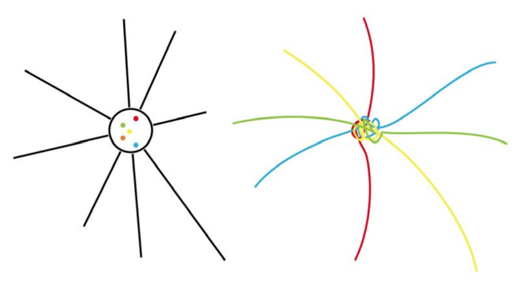 왼쪽의 장소 모델은 안과 밖이 명확히 나뉘며, “거주자”들의 정체성과는 무관한 배경이나 용기(container)처럼 기능한다. 반면에 오른쪽에 제시된 매듭으로서의 장소는 생명선들의 얽혀감, 즉 사람들의 관계에 의해 끊임없이 형성된다.