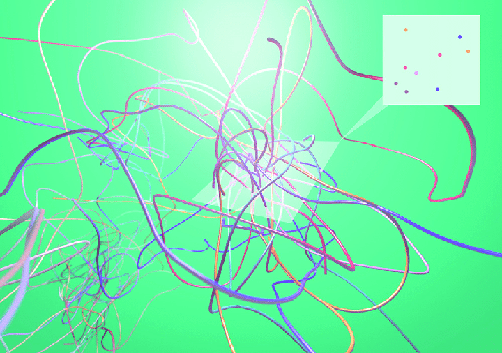 어떤 선들은 특정 이슈에 깊이, 혹은 살짝 스치며 얽히고, 어떤 선들은 한때는 뜨겁게 조응하다가 페미니즘 장과 멀어지기도 하고, 또 어떤 선들은 나중에 새로 합류해 다른 매듭을 만들기도 한다. 이렇게 서로 다른 리듬과 궤적으로 뻗어나가는 선들의 뒤얽히며 만들어내는 그 관계의 장. 이것이 매시가 제안하는 공간의 예일 것이며, 바로 이것이 내가 상상하는 페미니즘 리부트라는 공간이기도 하다. 이 공간은 다음과 같은 그림으로 시각화할 수 있다.